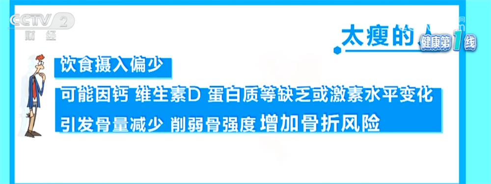 复旦大学附属华东医院骨质疏松科主任医师洪维称★◈◈✿:“研究显示★◈◈✿,如果你的BMI指数超过35★◈◈✿,你的骨质疏松性骨折的风险也会提高★◈◈✿。当你的脂肪全部长在腹部的时候★◈◈✿,这个脂肪里面会产生很多炎症因子★◈◈✿,这个会加速骨骼的衰老★◈◈✿。另外★◈◈✿,当你过于肥胖的时候★◈◈✿,你跌倒风险会高★◈◈✿,头重脚轻★◈◈✿,所以这个时候也会发生骨折★◈◈✿。”